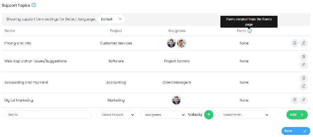 Add your form by clicking the "Update" button next to the relevant support topic.