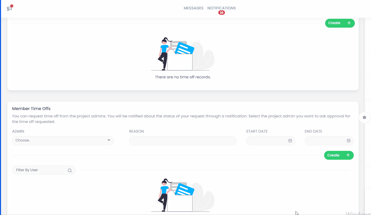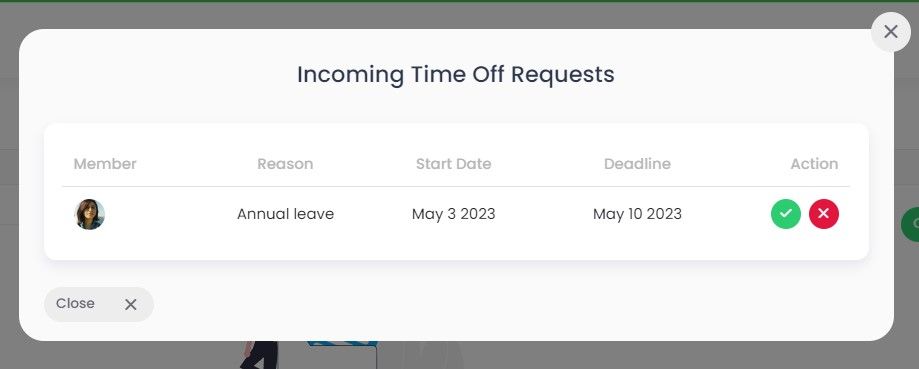 A notification will be sent to the project admin you have selected regarding your time off request. The admin can access the request by clicking the notification or the "Incoming Time Off Requests" field at the top right of the Member Time Offs field.