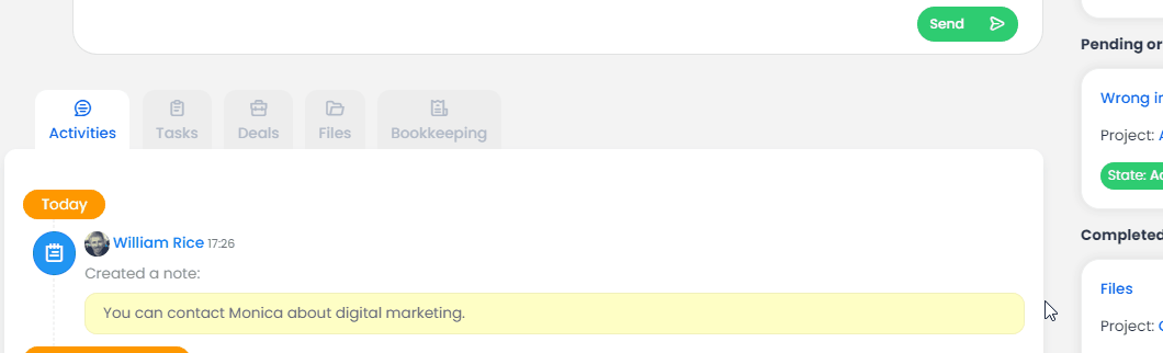 In order to do this, open the detail page of the client whose note you want to delete. Click the cross icon next to the note you want to delete in the Activities tab.