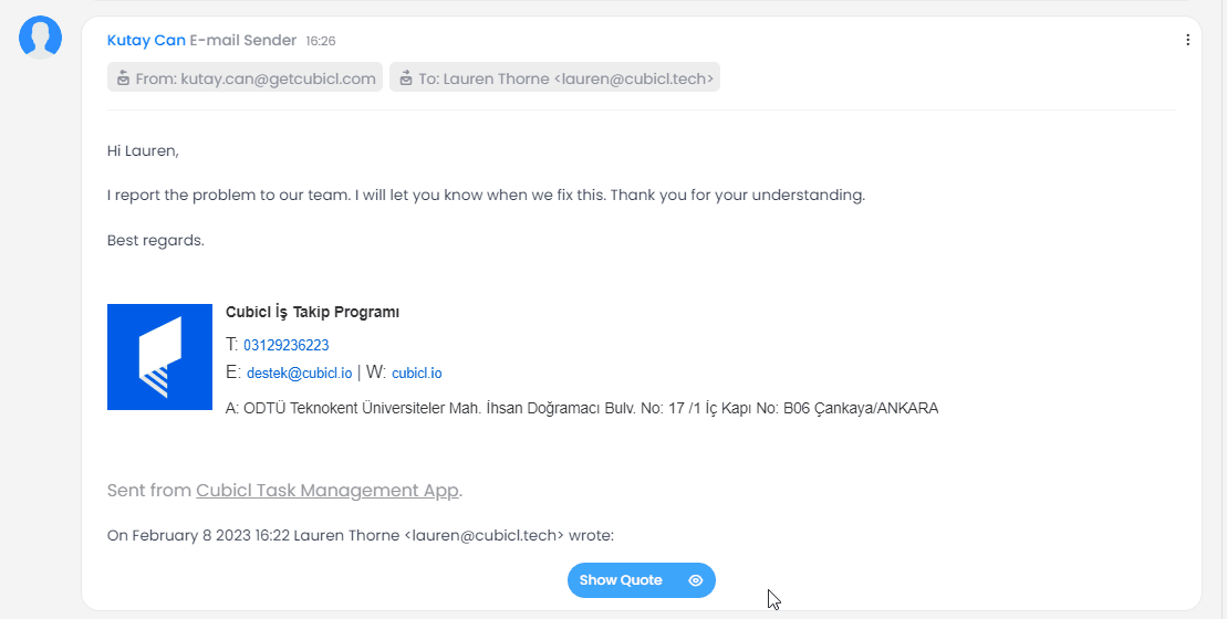 We have added an ignore sender button to prevent spam e-mails to create tasks in Cubicl. You can ignore senders by selecting the "Ignore Sender" option from the action menu of the task activity.