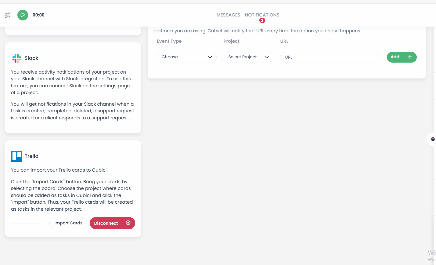 To get started, go to Others > Integrations in the left-hand menu and connect your Trello account. Once connected, click the "Import Cards" button. Next, select the Trello Board containing the cards you want to transfer. Then, choose the Cubicl project where these cards will be imported as tasks.